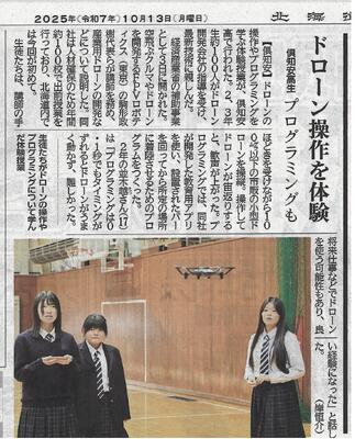 10月3日(金)、本校の2年生全員を対象に、情報Ⅰの授業において、FPVロボティックスによるドローン技術を体験する授業が行われました。授業では、ドローンを、事前プログラミングをして、コースをいかに正確に動かすことができるかを競い合うなど、考えながら操縦を工夫することも学ぶこともできました。その様子は、10月13日の北海道新聞朝刊でも紹介されました。